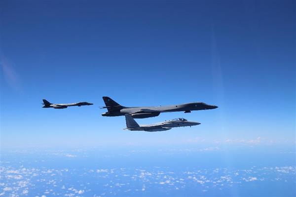 航空自衛隊は16日、那覇基地所属のF15戦闘機2機と、グアムから飛来した米空軍のB1戦略爆撃機2機が同日午前、東シナ海上空で編隊飛行の共同訓練を実施したと発表した。