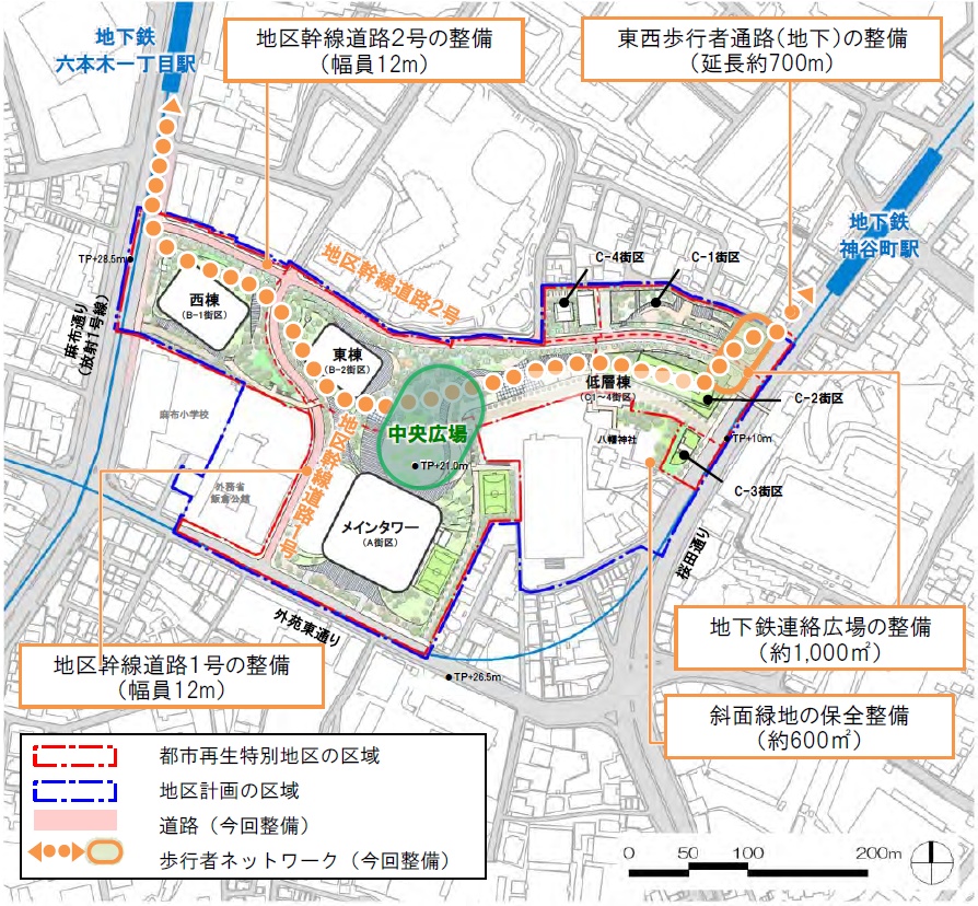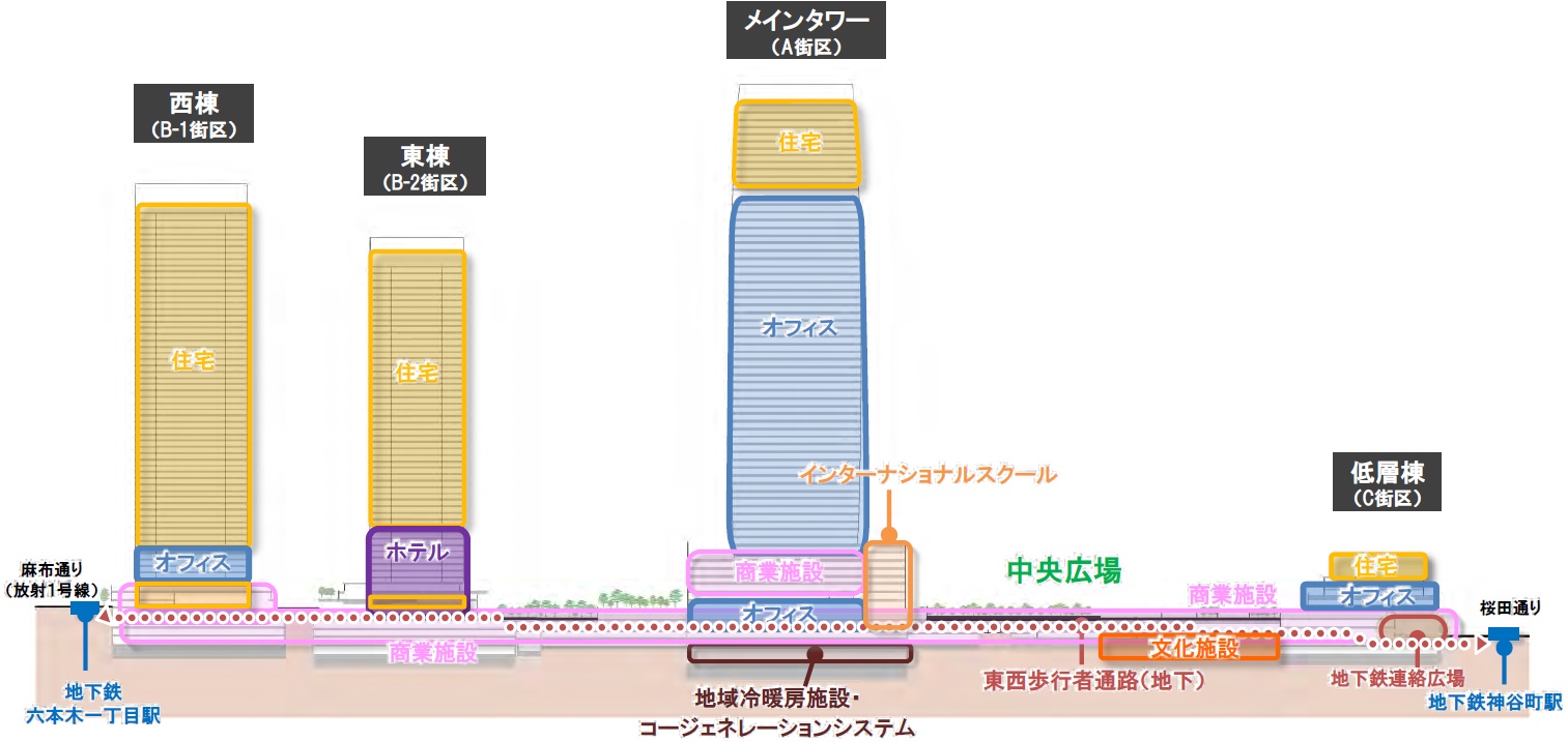 地上の建築物と緑あふれる街にしか注目していませんでしたが、700mもの距離の神谷町駅と六本木一丁目駅を繋ぐ地下通路沿いに商業施設がびっしりと入るので有れば、凄い地下街が出来る事になりますね。楽しみだなあ。