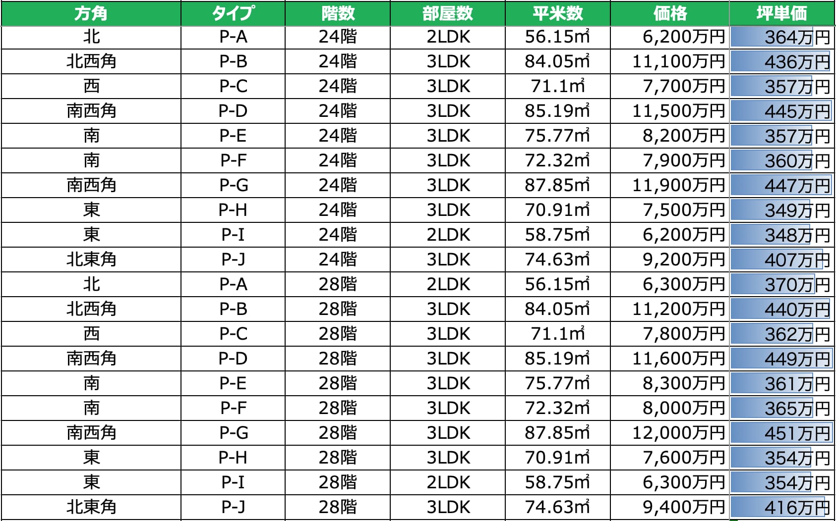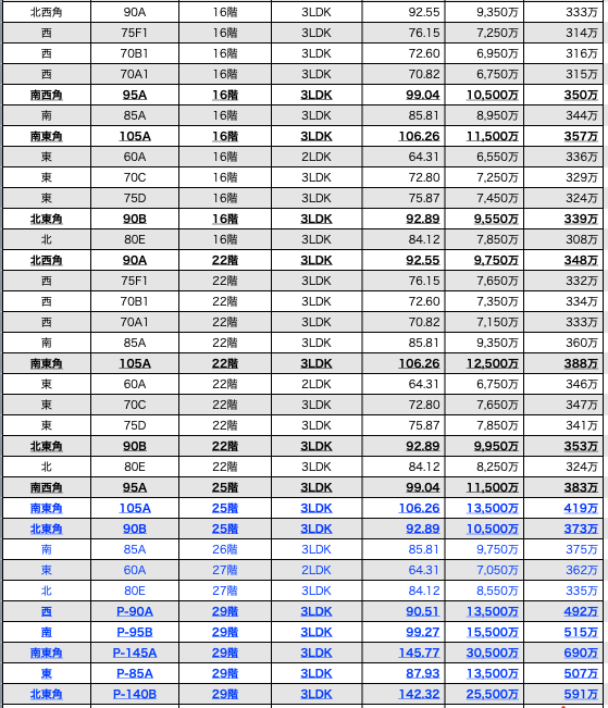 分譲時 価格一覧表(新築)