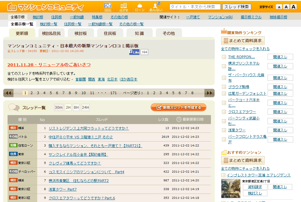 マンションコミュニティでは特集スレを立てて情報交換場所を提供 - 2011年11⽉